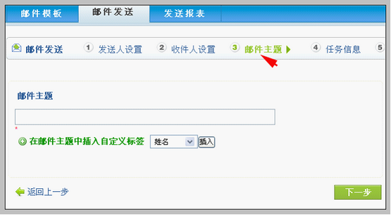 此步骤主要提示您本次任务您加入的收件人的数量。从上图可看出本任务中加入了61个人。 点击“下一步”按钮,进入邮件主题步骤。 填写邮件主题 邮件主题步骤,界面如下: