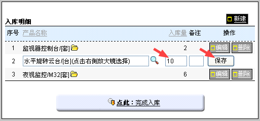 如果实际收到货物比入库单数量少,怎么处理? 采购入库的的入库单是根据采购明细生成的。 但是在实际过程中,库管收到的货品数量可能会和采购明细单有差异,可能是因为分批发货或者发货中的丢失,或者发货方少发等。 库管需要如实记录入库数量,没有收到的货品需让采购人员准确知道。 具体操作: 在“编辑明细,确认入库”的过程中,根据实际到货数量修改入库明细,保存后再入库。 比如:水平旋转云台原定到货13台,实际到货10。在该入库单中,入库明细中点击该产品后面的“编辑”按钮。如下图: 点击编辑后,修改入库量为10,并保存。 保存后,点击完成入库即可。