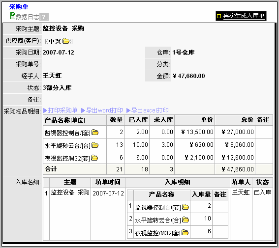 由于上面的操作,使入库明细的数量发生了变化,该入库单所对应的采购单会自动判断没有入库完成, 并在操作区域出现“再次生成入库单”的按钮,库管人员可看到。如下图: 查看该采购单的入库情况方法是:点击该采购单的采购主题字段。看到该采购单明细,如下图所示: 在这个界面中可看到该采购单对应的入库情况,如果是分多次入库,可显示多个入库记录。 |