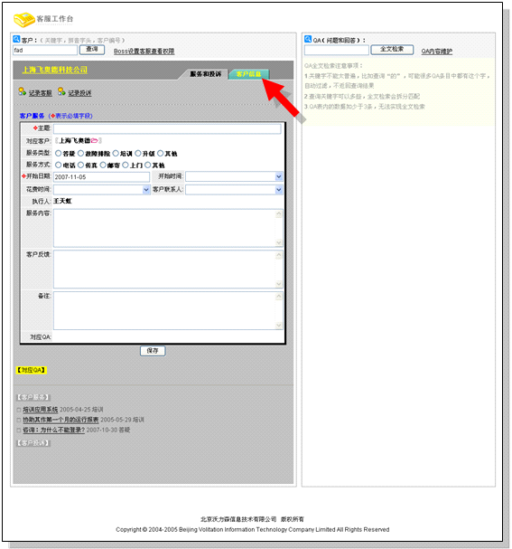 输入客户关键字或者客户编号,查询 在结果列表中,点击客户名称,看到下方出现该客户的服务界面 在这个界面中,可以直接录入客服数据,也可以直接记录投诉数据;还可以查看客户信息。我们来看这个界面: