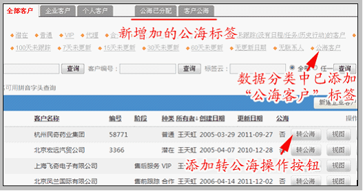 | ● | 添加“客户公海”标签,可查看全部的公海客户,对公海客户操作分配、领取。 |