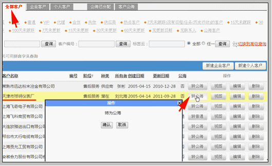 普通客户变为公海客户: 开启客户公海后我们可以将系统中的客户分为普通客户和公海客户。可通过客户列表中的“公海”标识来判断是否为公海客户。 操作入口:有账户权限的Boss用户或公海管理员用户登录系统 -> 客户列表下-> “全部客户”标签中,点击操作中“转公海”按钮,将普通客户转为公海客户。 如下图:我们将客户“天津市祥明仪表厂”转为公海客户。