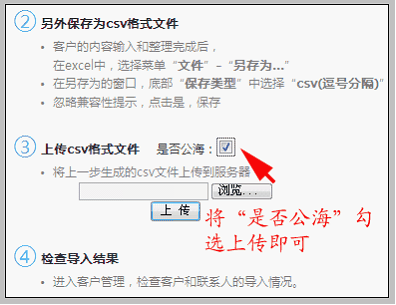 2.在下载的客户模板中,将导入的客户信息填写完整,点击另外为将保存类型设置为“CSV(逗号分隔)”类型文件。 3.将“是否公海”勾选,浏览上传CSV(逗号分隔)类型文件即可。