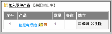 注意:在这个界面里,要进行的操作包括: 1)选择加入零件产品和成品产品 2)设置读权限 3)设置是否允许反向拆分 下面我们逐步讲解。 选择加入零件产品和成品产品 重要提示:这一步要做的是,告诉系统每装配一套成品需要几种几个零件。 以前面我们举得例子:1台电源+5套4mm螺栓+2套6mm螺栓+1套机箱+2套母板=1台监控控制器 点击“加入零件产品”