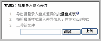 在方法2的区域,点击“批量盘点表”,下载。 填写差异 下载后在excel中打开,填写下图中红色箭头指示的列,即为差异。 填写时注意: