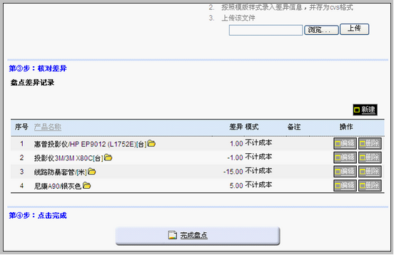 填写后保存为csv文件 填写差异,将文件保存为csv格式 上传文件 上传该文件后,可看到界面底部出现盘点明细,如下图: