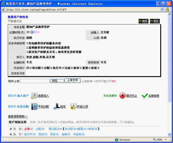 注意:处理时限,该任务中的某客户被分配或被领用后开始计时,如果该客户的此批量任务逾期未完成,则被自动重置,也就是说从当前执行人处收回,等待重新分配换人处理。如果该任务并不需要设置时限,可输入0。执行人,一般选择多个人,也就是说这些客户的事务交给哪些人执行。 点击保存。 进入批量客户任务视图,加入客户 点击新建立的批量任务主题,进入视图,如下: