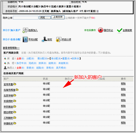 注意:刚加入的客户在没有分配之前,是允许从该任务中移除的。一旦被分配,则不允许移除。 下面我们做第二步操作:分配任务。 |
