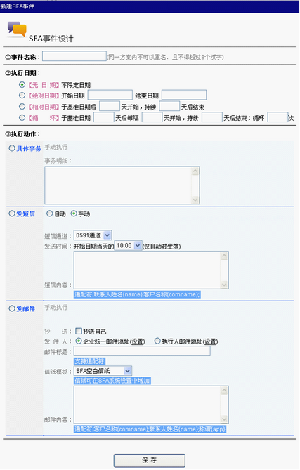 我们要通过新建SFA事件,来设定SFA序列中的标准环节或规范事件。注意:事件的设定主要分为两部分:1)执行的日期,支持绝对日期、相对日期和循环 2)执行事务,包括具体事项、发邮件、自动和手动发短信,其中邮件和短信均支持模板。