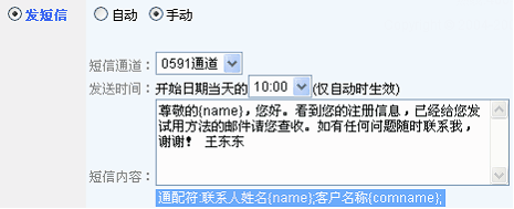 首先选择自动和手动。自动:指的是到执行时间开始的那天,自动发给客户,不需要确认。手动指的是,到执行时间开始的那天,在SFA工作台出现执行提醒,由人工确认后,点击执行事件即可。另外,短信内容支持通配符,包括客户的姓名和公司名称。举例如下: