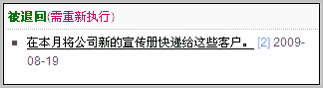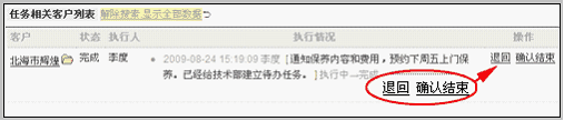 该客户后面的操作区域可以看到:退回和确认结束两个功能。根据该执行人的执行情况,判断进行哪种操作。比如:点击确认结束,看到提示并点击确认。则该客户会从列表中消失,因为其状态已经变成“结束”。点击解除搜索,可看到该客户排在第一个。 退回一个客户任务 如前所述,在已经完成的客户操作区域点击退回,填写退回原因,并点击退回执行人继续执行按钮即可。这时,该客户状态变为“执行中”。 执行人可以在自己的批量任务列表中可以看到:被退回的任务,如下图: