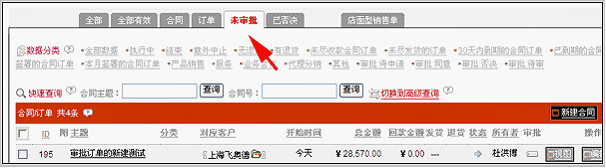 新建的合同订单所在标签为“未审批” 因为新建的订单还没有审批,所以在合同订单列表中,自动进入未审批标签。 当然,我们也可以在“全部”标签中看到这个订单。