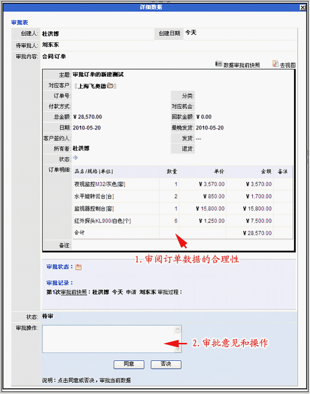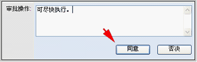 审批人在这个界面上可以看到申请审批数据的详细信息。查看详细信息的合理性,并审批“同意”或者“否决”。方框内可以写一些审批意见,也可以不写。 如果同意,则点击“同意”按钮。
