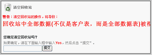 彻底删除和恢复的特殊提示: 当彻底删除客户时,客户相关的各种数据都被删除,包括:联系人、跟踪、售前售中售后等; 当恢复客户时,客户相关的各种数据都被恢复。 清空回收站的提示 由于清空回收站的操作是需要格外谨慎的,在此界面,出现下图所示的大字提示: