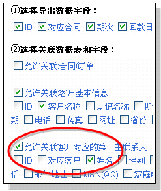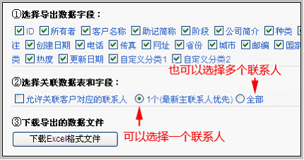 通过单表导出,可以大大增强对单表数据统计的灵活性;同时,还可以辅助生成数据汇总。 比如:某类客户的基本信息和联系人列表;比如:打印信封所需要的邮编、地址、客户单位、收件人姓名等。 操作方法: 赋予单表导出权限(老板用户) 单表导出需要老板用户授权 单表导出的操作方法 被赋予单表导出权限的用户,可以在数据表的下方看到“导出excel格式数据”的链接。如下图: 点击“导出excel格式数据”的链接,进入单表导出界面。 我们以“合同回款表”导出为例说明: 分为三个步骤:1)选择导出数据字段 2)选择关联数据表和字段 3)下载导出的文件。如下图所示: 您可以任意选择所需要导出的字段。第1)步的选择操作比较简单,只需要选择相应的字段即可。 第2)步的操作是:首先选择相应的关联表,然后选择关联表内的字段。关联表的操作作用我们来举例说明: 比如在回款记录表中,我们需要导出某项回款的客户名称,则可以在“允许关联:客户基本信息”前打勾,如下图所示: 然后在关联的客户基本信息中选择“客户名称”(打勾)。如果需要同时导出该客户的联系人,则需要在“允许关联客户队赢得第一主联系人”前打勾,并选择人员姓名,如下图: 选择完毕后,点击“下载excel格式文件”按钮,获取下载的文件。在excel中打开,如下图: 可以看到:客户名称和姓名字段也同时被导出了。 客户导出时选择导出对应联系人 说明 使用“导出到excel格式数据”功能导出客户数据时,可选择导出一个相应联系人,也可以选择导出全部相应联系人。 操作 在客户列表下方,点击导出到excel格式数据