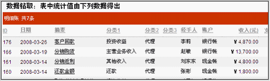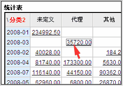 比如:5月份代理收入是28910元。但是如果我们希望看到这个统计值是由哪些数据算出的,或者深入查看符合该条件的收入明细,则需要使用钻取功能。