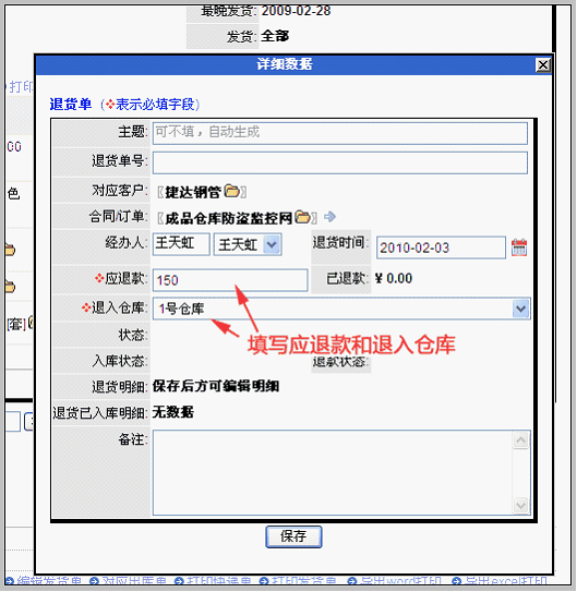 注意填写清楚应退款金额和退货后产品入库的仓库。其中:应退款金额在实际应用中应该是和客户事先沟通好的。填写后保存。保存后,即可在订单视图内,看到红色退货单。如下图所示: