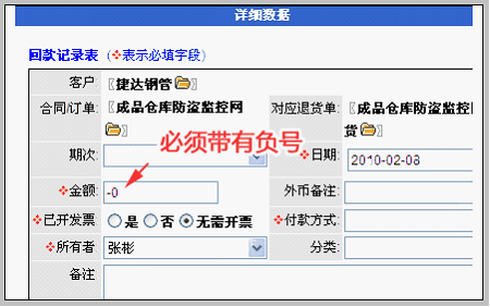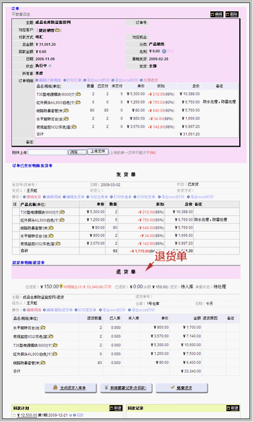 编辑退货单明细 在上一步退货单建立后,自动把订单明细中全部产品加入退货明细。编辑退货单明细的方法是:在退货单操作区域点击“编辑明细”。 进入退货单明细编辑界面,注意:这里的退货明细是自动从订单明细中读取全部的数据,操作时,只需要删除不必要的项目即可。具体如下: 只保留退货产品,修改退货数量,并填写退货原因。 保存明细。 至此,退货明细编辑完成。下面要做的是:使用退货单,管理退回产品的入库情况、管理退款情况。 管理退货入库 如上图所示,在明细编辑完成后的退货单底部,点击“生成退货入库单”的操作按钮。 点击后,系统根据退货单明细生成退货入库单。 等待库管人员确认该入库单入库。 记录退款 在退货单中,点击“新建退款记录(负回款)”按钮。 新建退款和新建回款的方法类似,区别在于:退款是用负回款实现的。如下图: 即:记录退款时必须在金额中带有负号。退款记录后,将在本订单视图中的回款模块中显示,如下图所示。 |