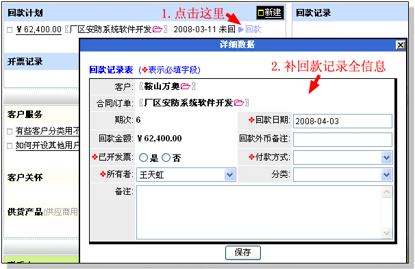 保存后,在回款记录中出现与该回款计划相对应的回款记录,如下图所示: