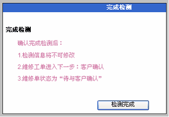 在编辑检测信息时,需要注意: 检测说明:需详细填写检测结果; 预计维修天数:填写天数,比如2。则会在开始维修后,根据预计维修天数自动计算出维修完成日期(只在选择方式3时有效) 编辑配件和服务明细的方法,请参见方式2中“变更配件服务明细”。 这两步操作完后: 点击“完成检测,进入下一步:客户确认” 看到提示如下: