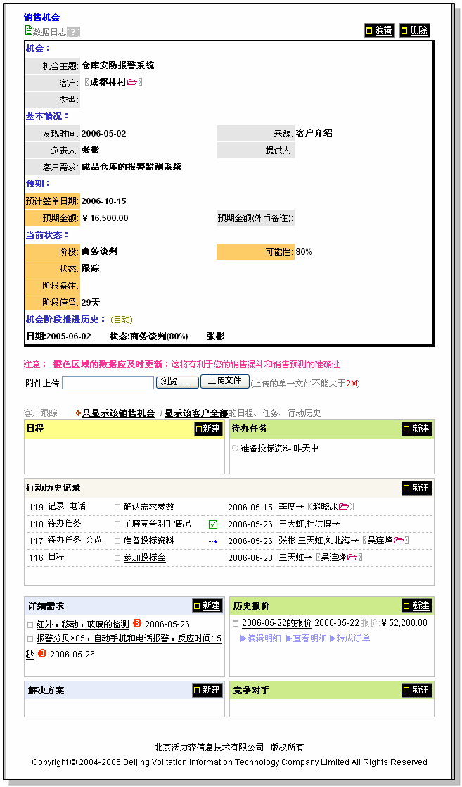 销售机会基本信息,机会的跟踪(日程、待办任务、行动历史)、详细需求、历史报价、解决方案、竞争对手。