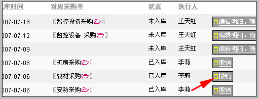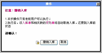 采购入库的撤销和直接入库的撤销功能 说明: 不管是由采购单生成的入库单还是直接填写的入库单,都可以执行撤销入库的操作。 只有Boss用户有权限执行撤销操作。 撤销入库后,如果该入库单是由采购单生成,采购单可以重新生成入库单,也可以直接删除该采购单。 撤销入库的操作方法: 1.用Boss用户登录,进入“入库单”列表 可以看到,已经确认入库的入库单,后面能看到“撤销”的按钮,如下图: