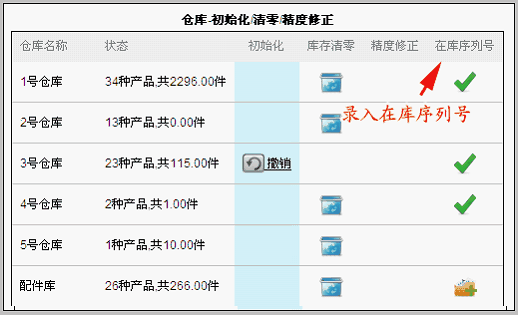图中所示:有些仓库已经设置了序列号产品,并根据在库序列号录入情况出现不同的图标。其中,