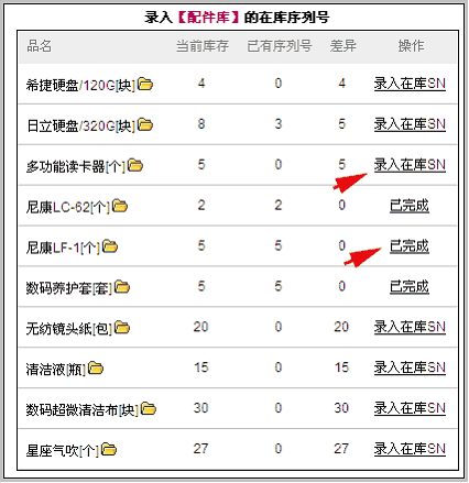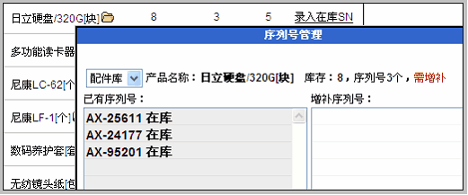 注意:数据仅举例用,实际应用中一般不应该把读卡器、镜头纸、清洁液等低价值产品设置为序列号管理。 在此界面中,列出了本仓库内全部序列号产品,以及在库序列号的录入情况。 以下图为例:表明该产品库存值8个,录入了序列号3个,还需录入5个。