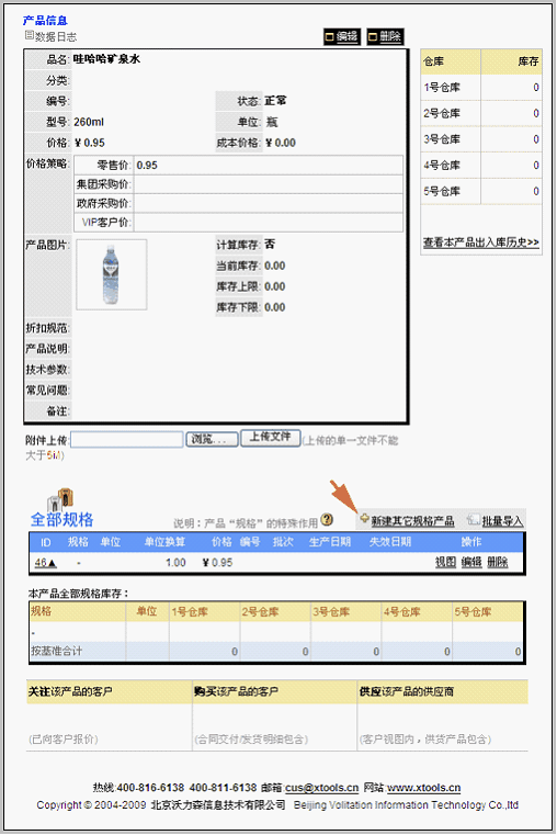 在产品视图内管理多规格产品 前面我们讲到,在产品视图界面、编辑订单明细界面、编辑采购明细界面以及编辑出入库明细界面时,均可新建其他规格产品。首先我们来看在产品视图内如何操作。 当我们在产品列表内新建产品,或者导入产品时,产品的规格字段是不可以编辑的,自动为“-”。只有当为该产品新建了其它规格产品后,该产品的规格字段变为“基准”。举例说明: 比如我们在产品中,新建了“哇哈哈矿泉水”,保存后在产品列表中如下所示 注意看图中,该产品的规格是“-”。 下面我们来为该产品建立多规格,包括:小箱12瓶,大箱24瓶两种。 进入产品视图