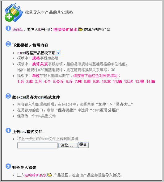 按照要求提示,填写各项内容后保存为CSV文件,上传提交。规格名称,单位,单位换算都应该填写准确。注意:在这个界面导入的仅仅是“哇哈哈矿泉水”的多规格产品。