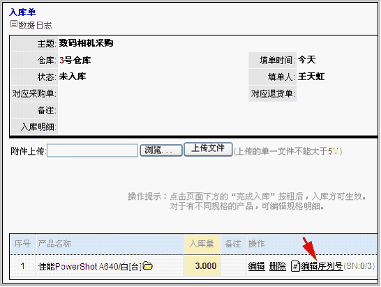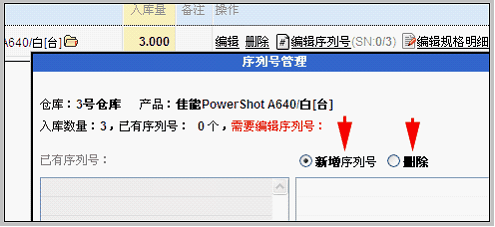 2/3表示:有3个入库产品,已经录入了2个序列号。 |
