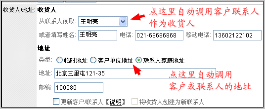 | a) | 可直接选择客户联系人作为收货人,并自动读取该联系人的电话和移动电话