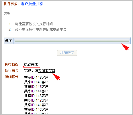 点击执行结果后的“关闭本窗口”钮退出本页面,批量客户共享/转移页面自动刷新,可看到共享操作已成功。.