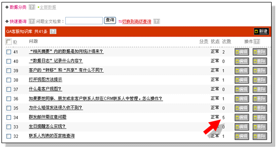 上图是QA库,在列表中可看到每个问题被记录的次数,也就是被客户咨询的次数。