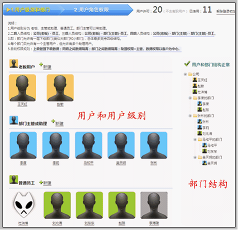 左侧部分是用户和用户级别,右侧部分是公司部门结构树。