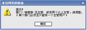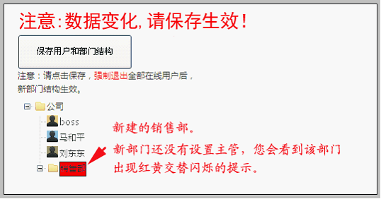 由于这个部门还没设置主管,所以会出现红黄两色的交替闪烁。这是系统自动的完整性校验功能。 即:每个部门必须且只允许有一个主管用户。所以我们需要继续为新建部门添加相应的人员。 |